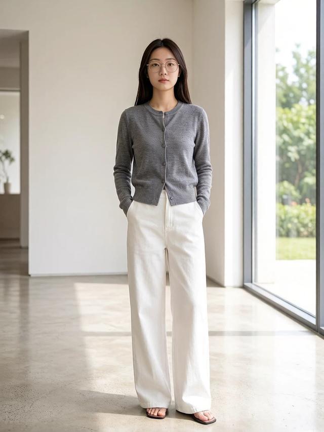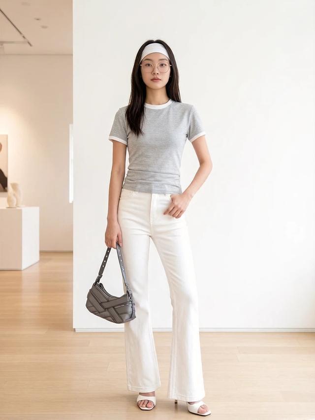 对不经常穿白色牛仔裤的姐妹来说,浅灰色、花灰色、白灰色上衣颜色与纯白色牛仔裤搭配和谐顺眼,非常耐看,符合大众偏爱的上浅下深配色逻辑,外穿出门不扭捏。