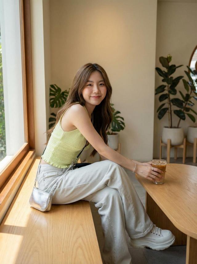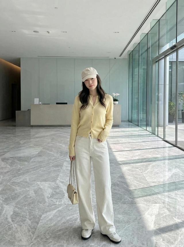喜欢清纯文艺风格的姐妹,可以认准马卡龙色系中的淡黄色针织T恤或正肩T恤,喜欢清纯纯欲风格的姐妹,像博主一样选择淡黄色吊带背心与白色长裤搭配,也能轻松赚足回头率。