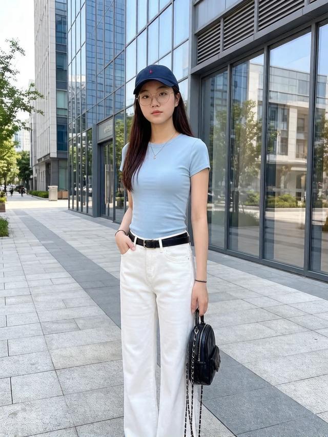 能和纯白色牛仔裤保持统一氛围和美感的蓝色上衣也是有讲究的,只有像博主一样的baby蓝上衣与纯白色牛仔裤搭配才不会踩雷。