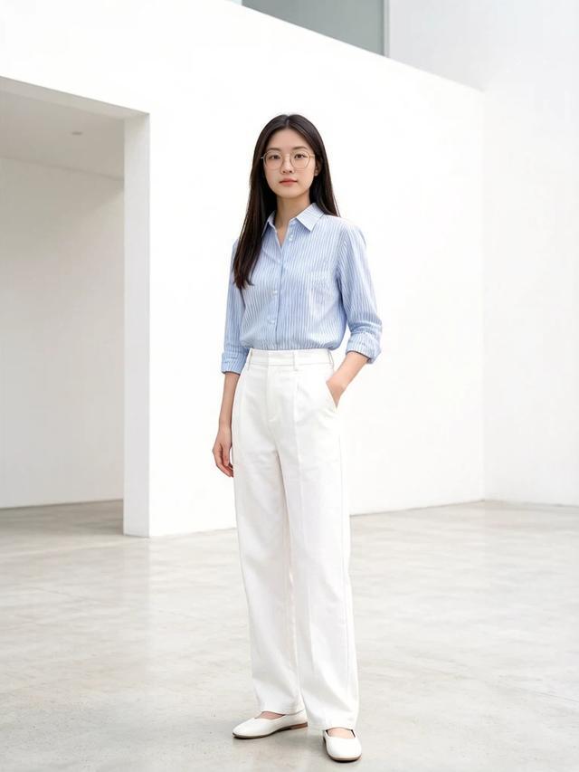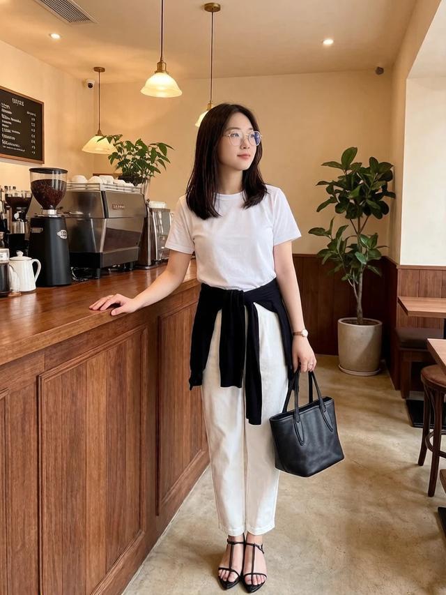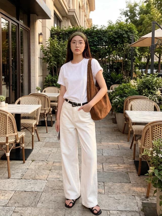 纯白色T恤与米白色牛仔裤搭配是最佳模板,担心上下顺色造型过于简单的姐妹,可以像博主一样在腰间系一件轻薄长衫,颜色以黑色、深蓝色、深灰色为主不会出错。