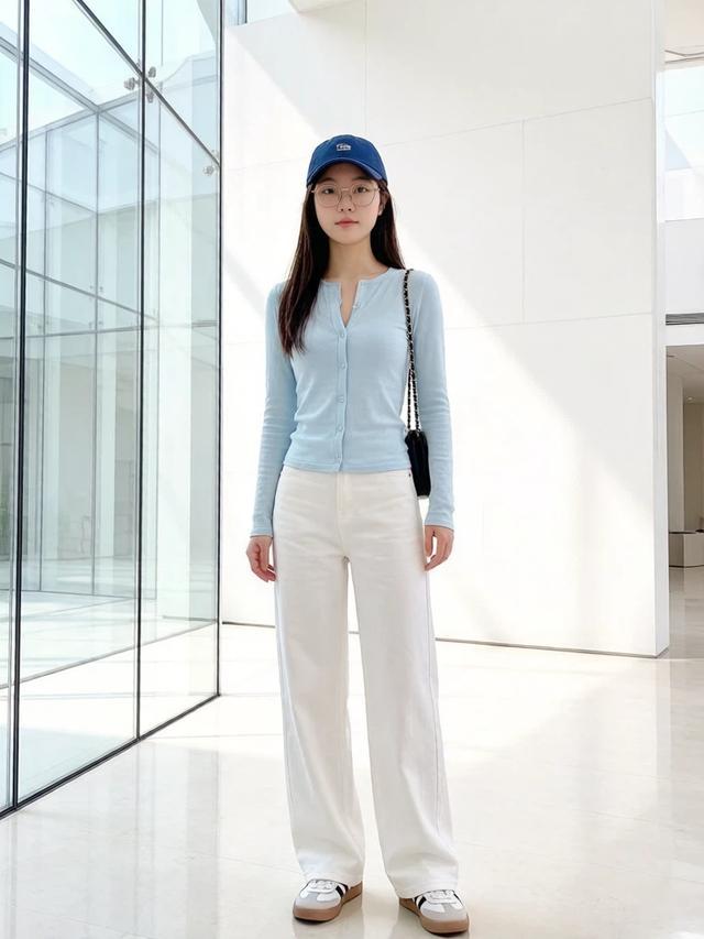这里说一下,和其他颜色上衣挑选白色牛仔裤不同的是,选择与淡蓝色上衣搭配的白色牛仔裤时一定要以窄版拖地直筒款式为主。